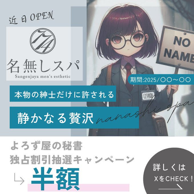 2025/04/13 | 近々オープン予定な「名無しスパ」とのコラボが決まりました。企画内容はまだ未定笑 |
